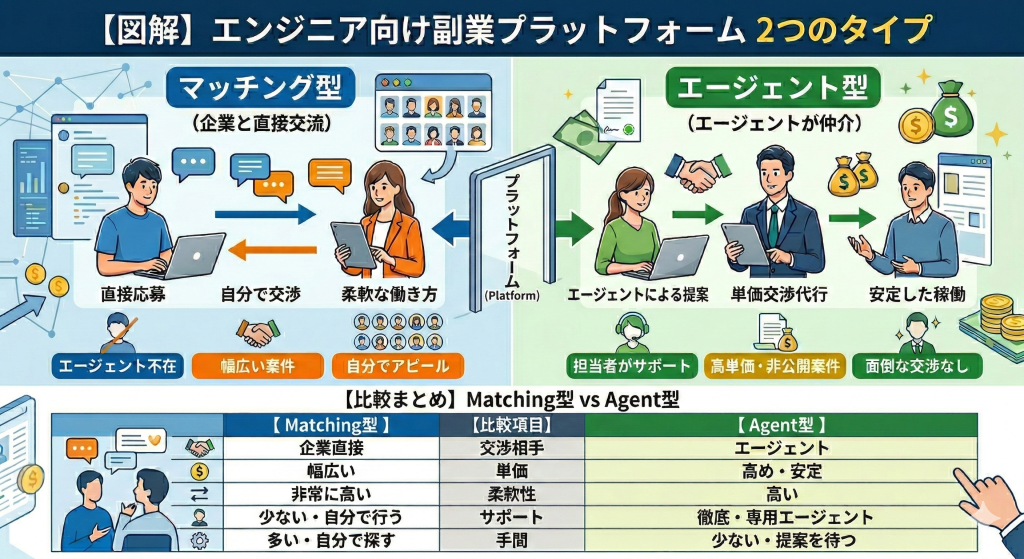 1. エンジニア向け副業プラットフォーム「マッチング型」と「エージェント型」の違い