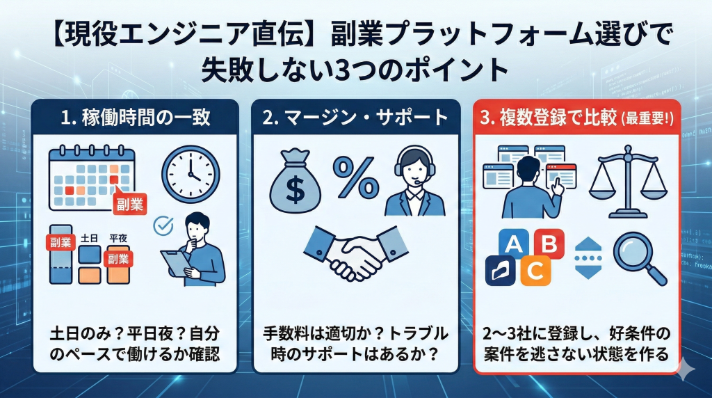 4. 現役エンジニアが教える!副業プラットフォーム選びで失敗しない3つのポイント