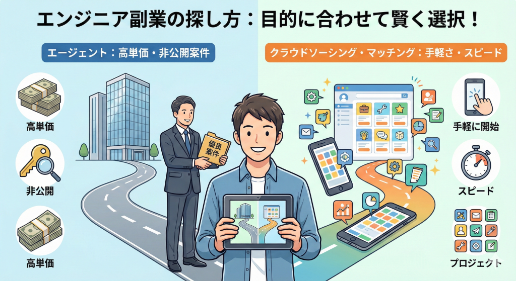 エンジニアの副業案件は、大きく分けて「エージェント型」と「クラウドソーシング(マッチング)型」の2つのプラットフォームに掲載されています。