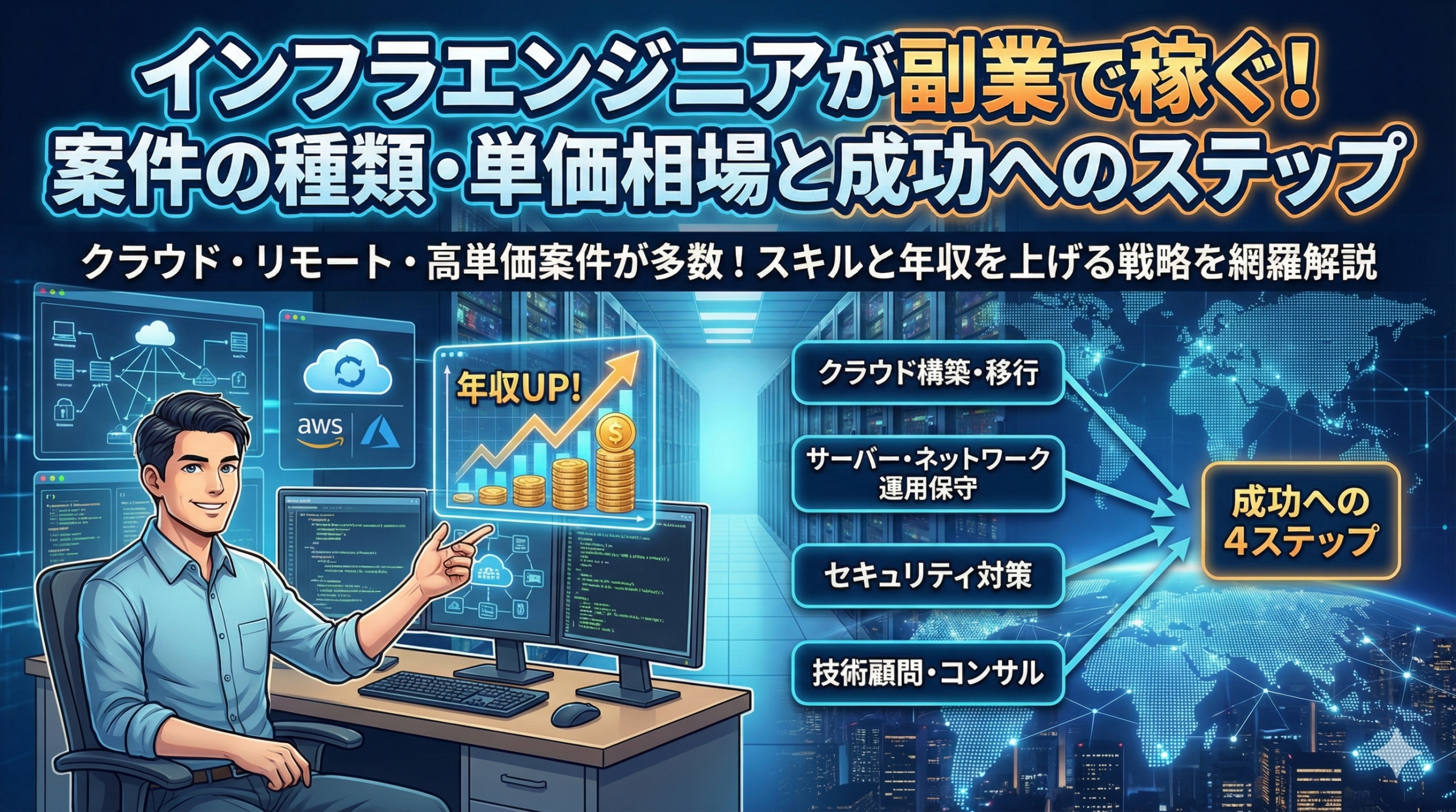 「月10万円」という金額は、インフラエンジニアにとっては決して高いハードルではありません。むしろ、近年のクラウド(AWS/Azure/GCP)需要の高まりにより、スキル次第では週1日の稼働で月20〜30万円を目指すことも十分に可能な世界です。