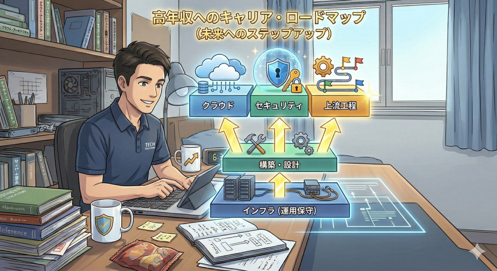 「今の現場でこれ以上の成長が見込めない」と感じた時が、最も効率的に年収を上げられるタイミングです。特にインフラの基礎がある方は、他職種への転身も有利に進みます。