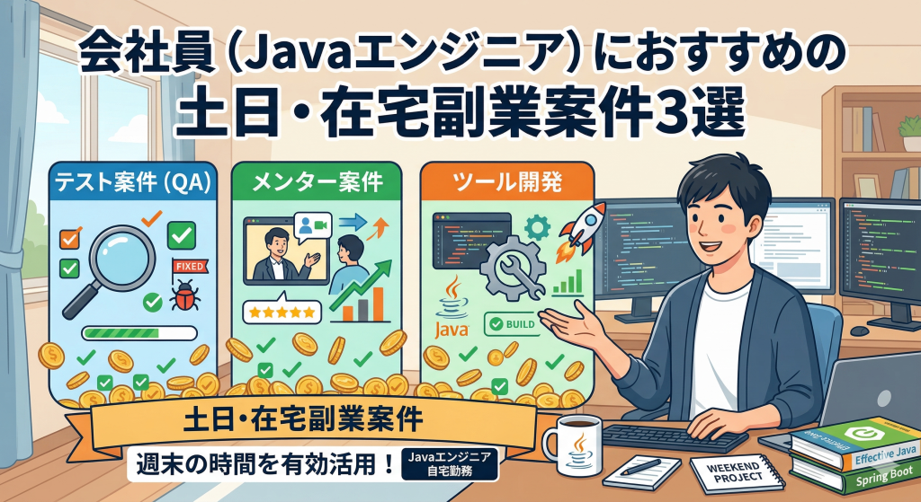 大規模開発が多いJavaでも、タスクが切り出された「テスト・保守」や「メンター業務」を狙えば、会社員が土日や在宅で取り組める副業案件は確実に見つかります。