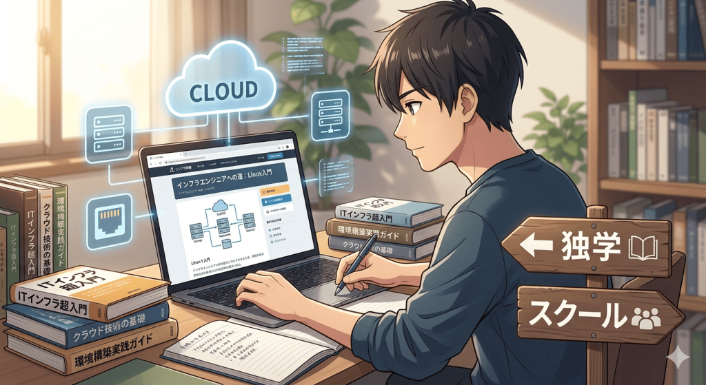 - 独学のメリット: コストを最小限に抑えられる。Ping-tなどの学習サイトや市販の書籍でCCNAやLPICといった資格取得を目指すのが一般的。