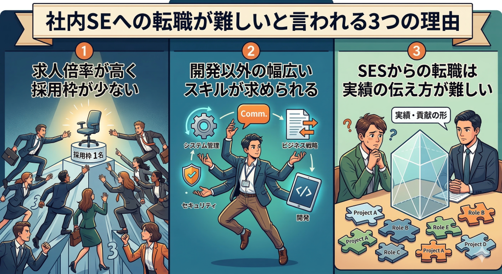 - 社内SEの難易度が高い理由は「枠の少なさ」と「幅広いスキルの要求」にあります。