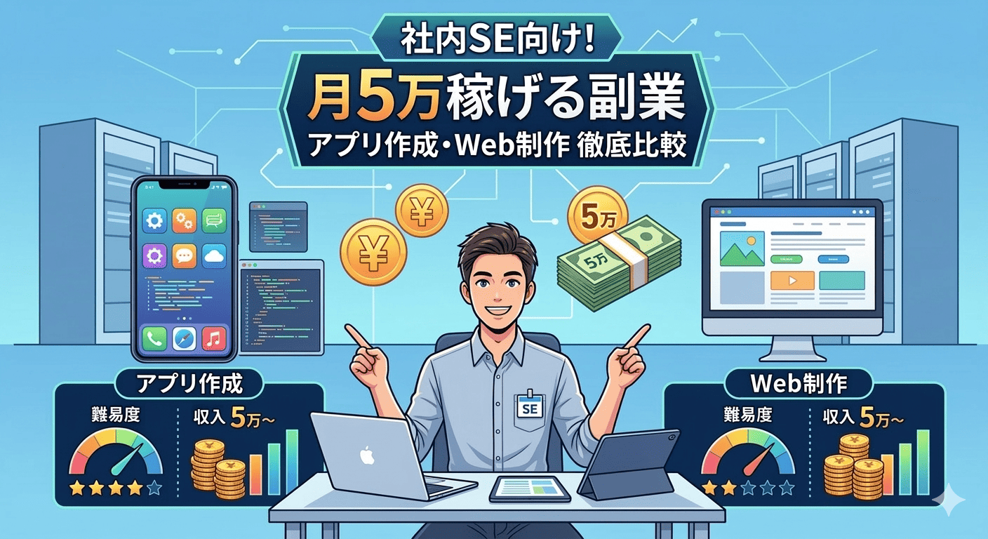 この「時間のゆとり」を活用して副業を始めることで、本業の収入プラスアルファを得られるだけでなく、社内システムのお守りだけでは身につかない新しい技術(Web制作やモダンなアプリ開発など)に触れる機会を作ることができます。結果として、今後のキャリアパスを広げることにも直結します。