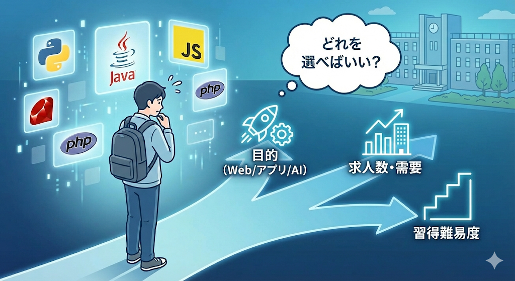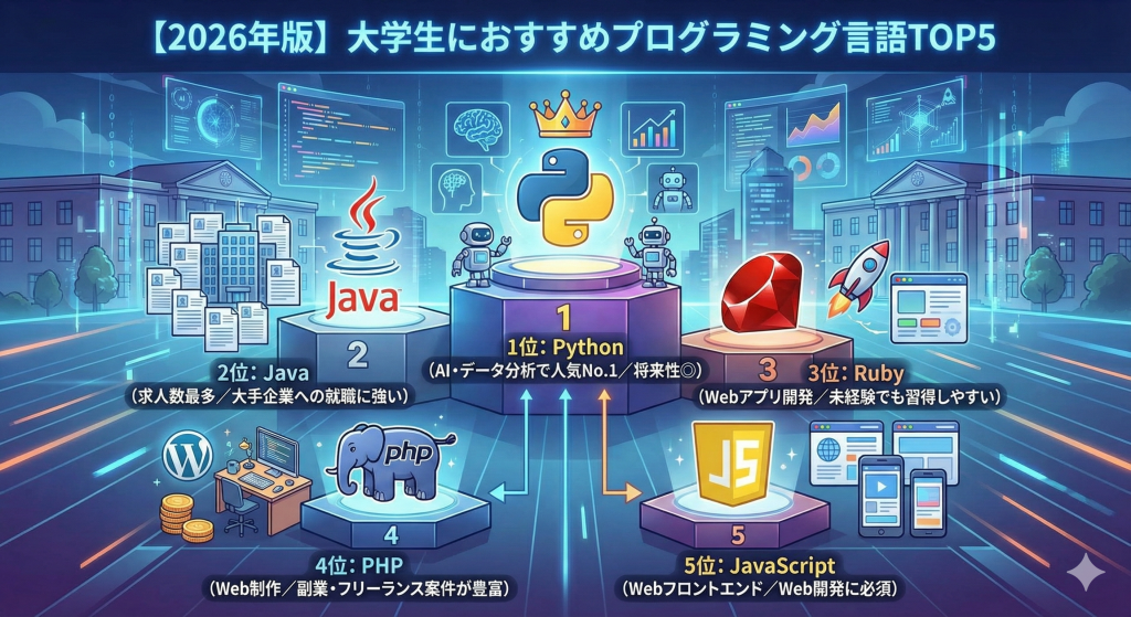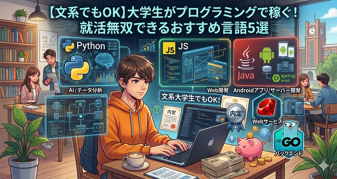 この記事では、現役社内SEの視点で「副業での稼ぎやすさ」と「就活コスパ(将来性)」の2軸から厳選した、大学生におすすめのプログラミング言語を5つ紹介します。