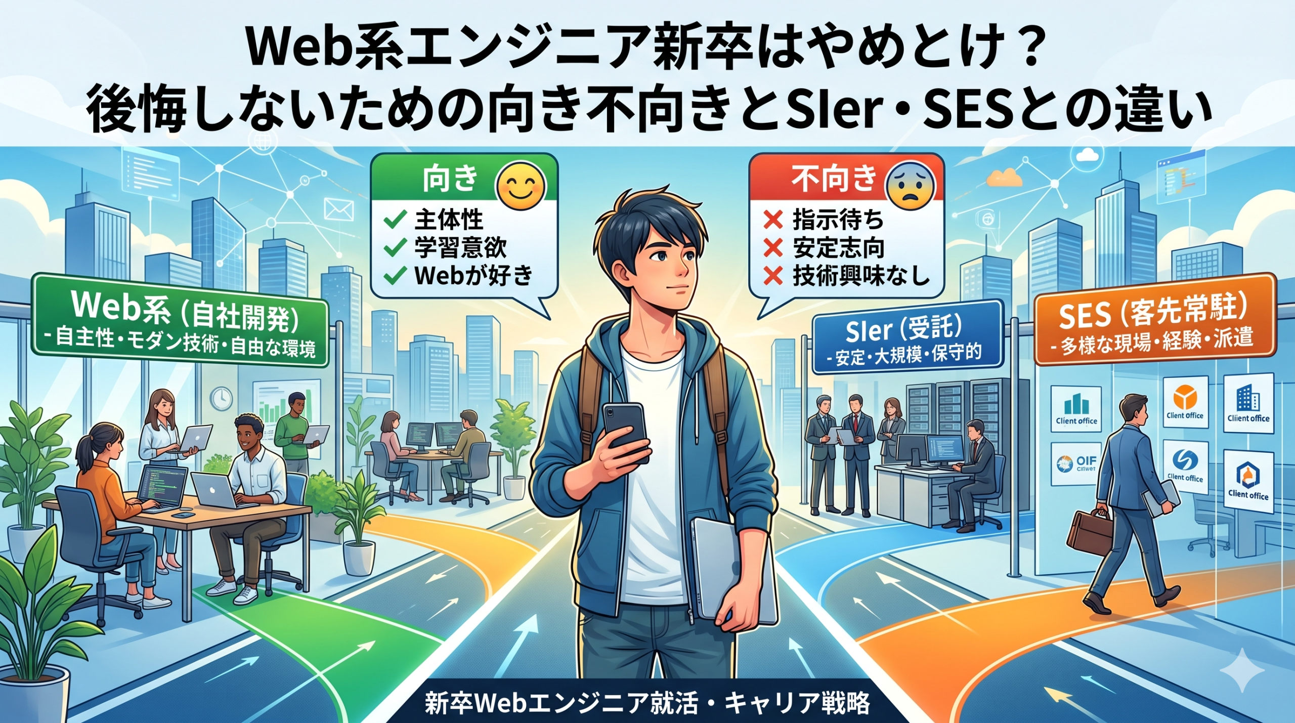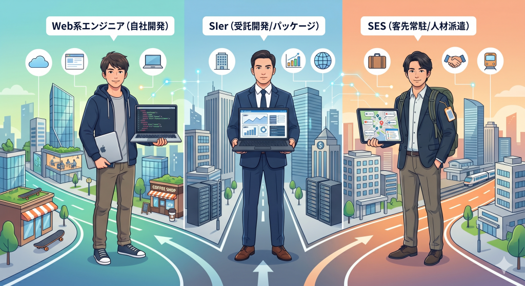 新卒エンジニアとして後悔しないためには、「自社開発(Web系)」「受託開発(SIer)」「客先常駐(SES)」の違いを正しく理解し、自分の性格に合った場所を選ぶことが重要です。
